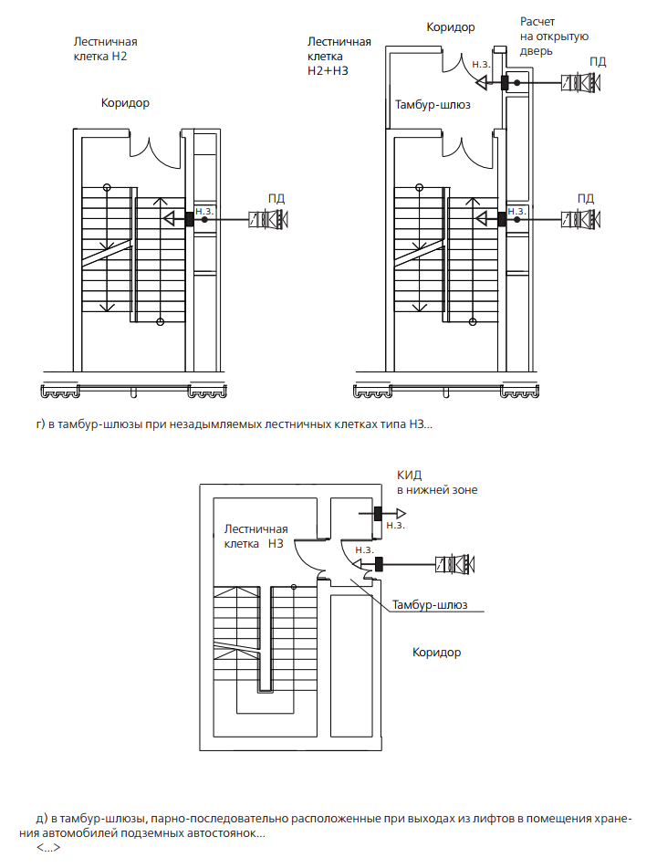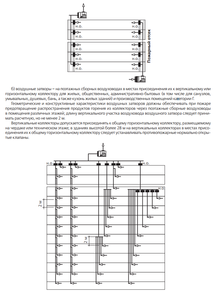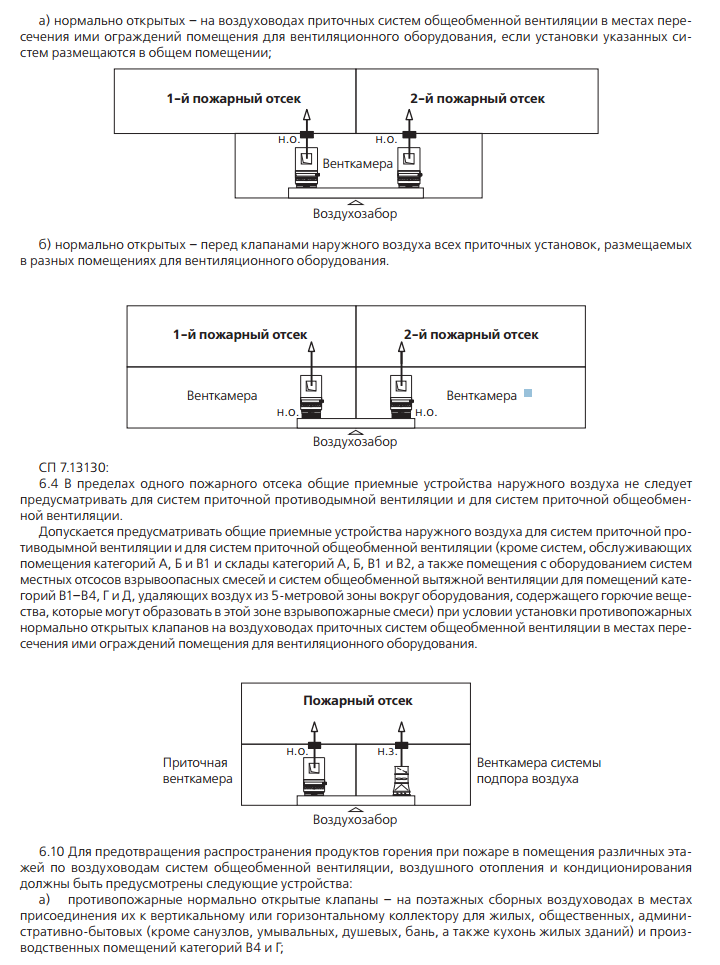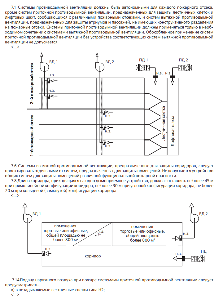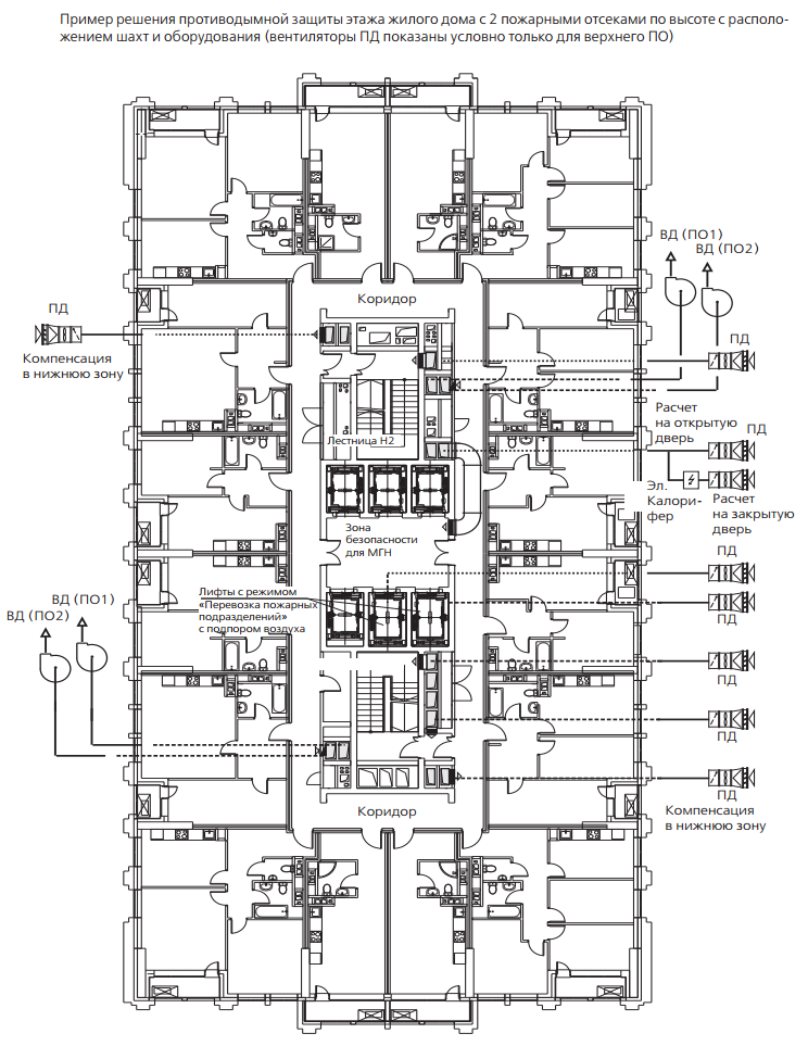Компенсирующая подача наружного воздуха приточной противодымной вентиляцией с механическим побуждением может быть предусмотрена автономными системами или с использованием систем подачи воздуха в тамбур-шлюзы или лифтовые шахты. При этом в ограждениях тамбур-шлюзов или лифтовых шахт, к которым непосредственно примыкают защищаемые помещения, должны предусматриваться специально выполненные проемы с установленными в них противопожарными нормально-закрытыми клапанами и регулируемыми жалюзийными решетками. Двери тамбур-шлюзов должны быть сблокированы с приводами клапанов в цикле противохода. Допускается применение клапанов избыточного давления в противопожарном исполнении с требуемыми пределами огнестойкости. Компенсирующий переток воздуха из шахт лифтов допускается только для лифтовых установок с режимом управления "пожарная опасность". Шахты лифтов с режимом "перевозка пожарных подразделений" и незадымляемые лестничные клетки типа Н2 использовать для подобного устройства не допускается.