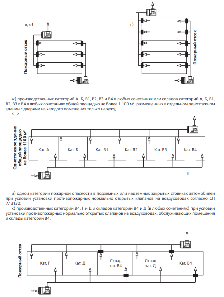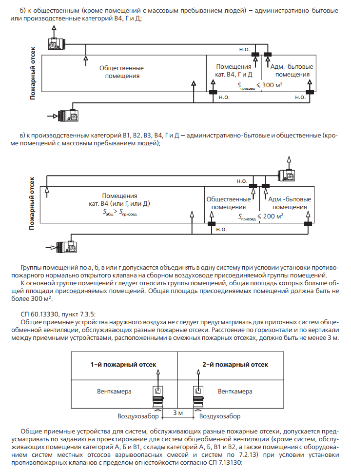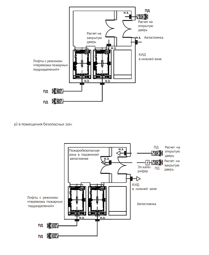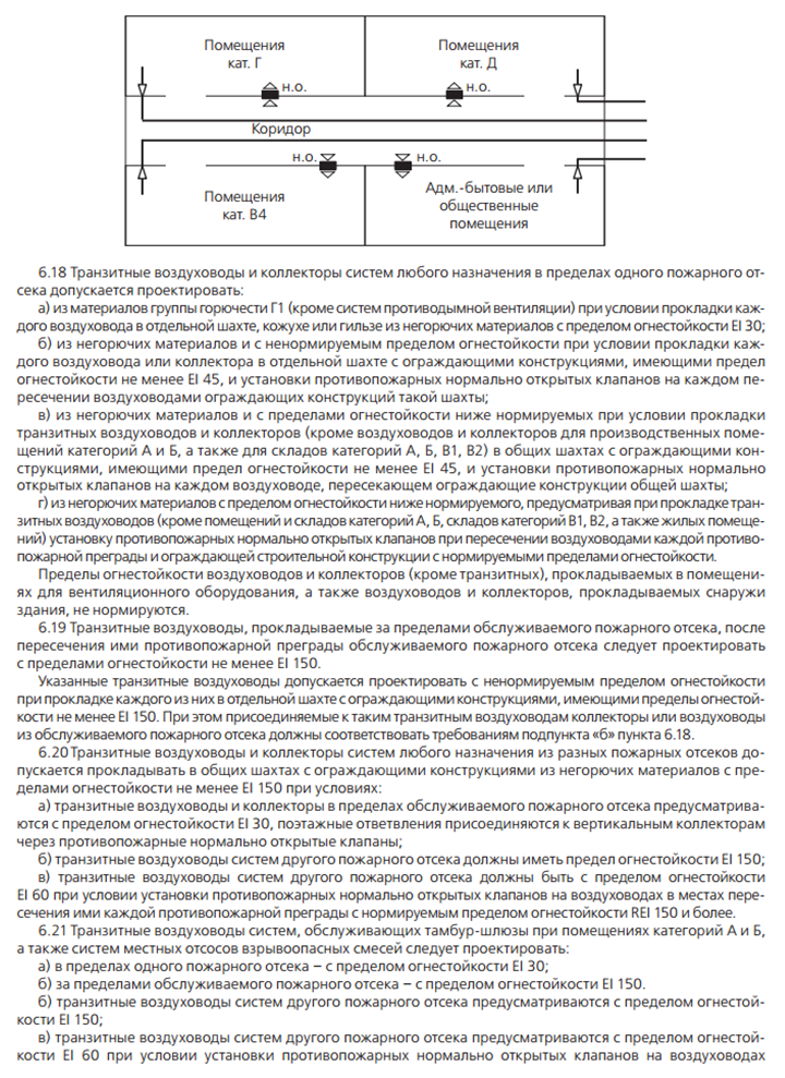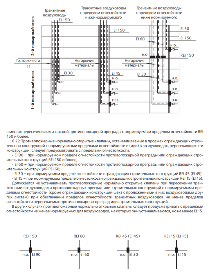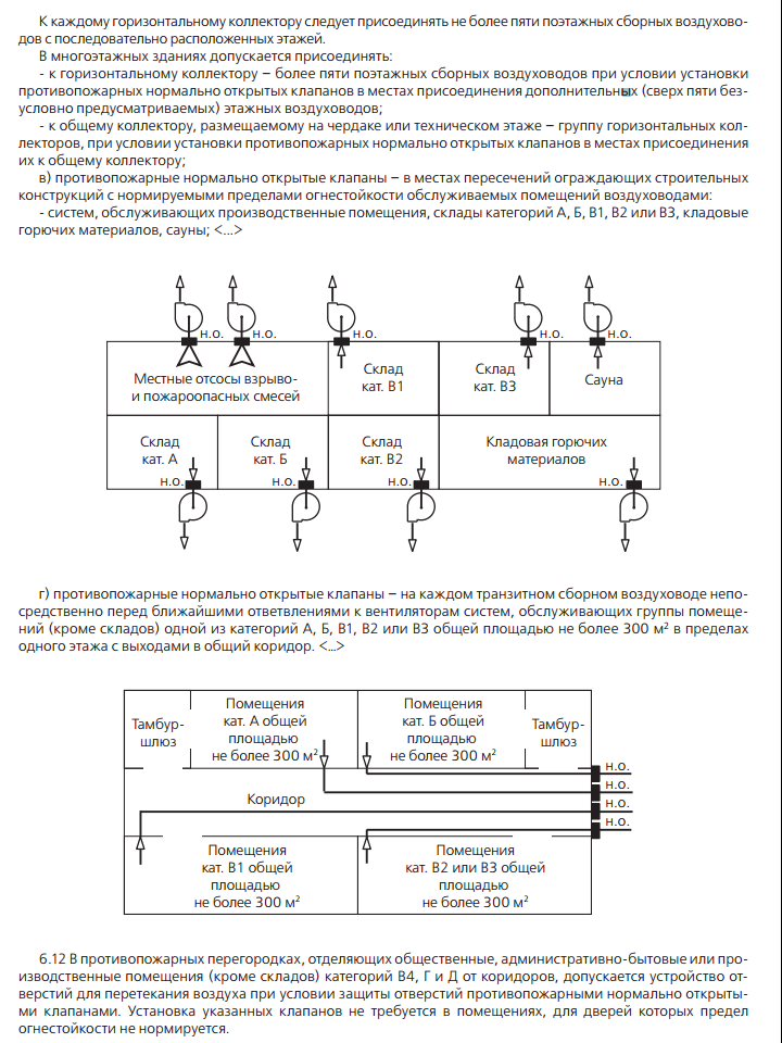 Компенсирующая подача наружного воздуха приточной противодымной вентиляцией с механическим побуждением может быть предусмотрена автономными системами или с использованием систем подачи воздуха в тамбур-шлюзы или лифтовые шахты. При этом в ограждениях тамбур-шлюзов или лифтовых шахт, к которым непосредственно примыкают защищаемые помещения, должны предусматриваться специально выполненные проемы с установленными в них противопожарными нормально-закрытыми клапанами и регулируемыми жалюзийными решетками. Двери тамбур-шлюзов должны быть сблокированы с приводами клапанов в цикле противохода. Допускается применение клапанов избыточного давления в противопожарном исполнении с требуемыми пределами огнестойкости. Компенсирующий переток воздуха из шахт лифтов допускается только для лифтовых установок с режимом управления "пожарная опасность". Шахты лифтов с режимом "перевозка пожарных подразделений" и незадымляемые лестничные клетки типа Н2 использовать для подобного устройства не допускается.